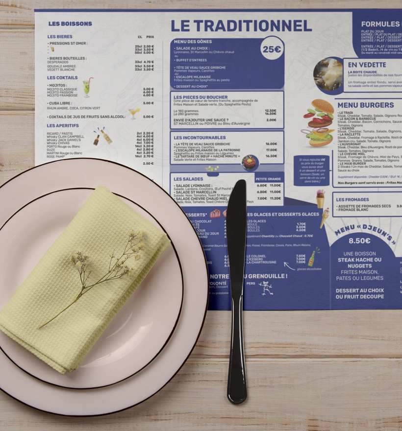 Le set de table personnalisé a l’avantage d’être d’une taille conséquente, en général A3, mais est aussi un support structuré. Il est en effet courant de voir des sets de tables dont le contenu est séparé par des cases ou autres formes de délimitations. Cela peut vous permettre de hiérarchiser vos informations ou votre menu, mais également de diversifier votre contenu sans que cela semble désordonné et sans rapport. Vous pouvez ainsi mettre une offre spéciale en avant dans une case plus colorée, insérer un QR code ou inclure un coupon de réduction, le tout sur un seul support.
